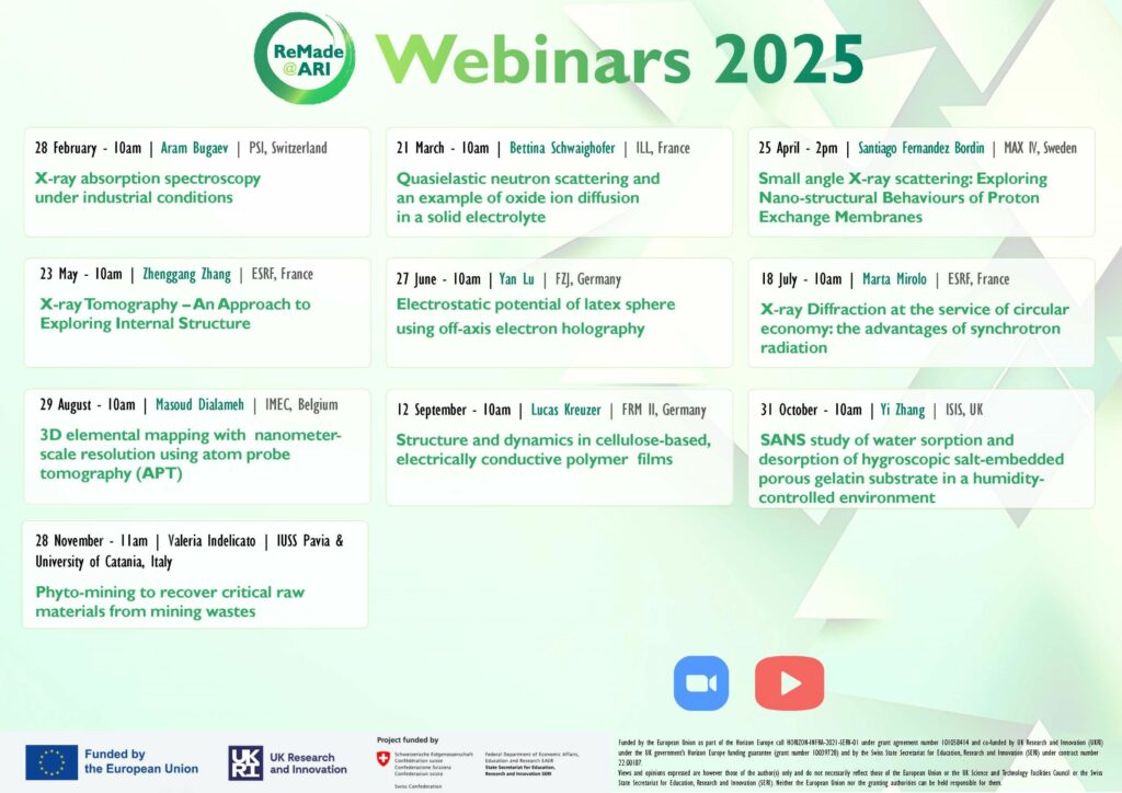 Description: “Expect to be amazed by presentations about advanced techniques harnessing ion and neutron beams, along with electrons, positrons, and high magnetic fields, to revolutionize the characterisation of recyclable materials. Explore methods for the deposition and preparation of nanostructures, microstructures, and surfaces. The agenda will also include talks from ReMade@ARI users to showcase network capabilities and project outcome, and an excursion to the ion and neutron beam infrastructures in Prague. Targeting mainly academic audience but industrial attendees may also find interest in the workshop content.”